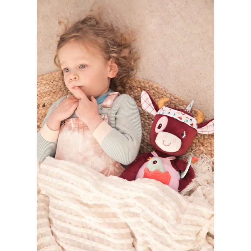 Denne søde ko er udstyret med så mange fine detaljer, der er lige til at gå på opdagelse i. Oven i hatten medfølger den sødeste bamse.