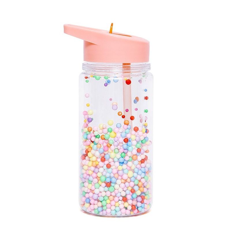 Drikkedunken er udstyret med løse konfettikuger, der ligger i et lag mellem yder- og indersiden af drikkedunken, og når der drikkes af flasken, hvirvler glimmeret rundt. Dunken har et fersken farvet låg og en praktisk drikketud.