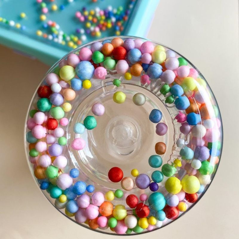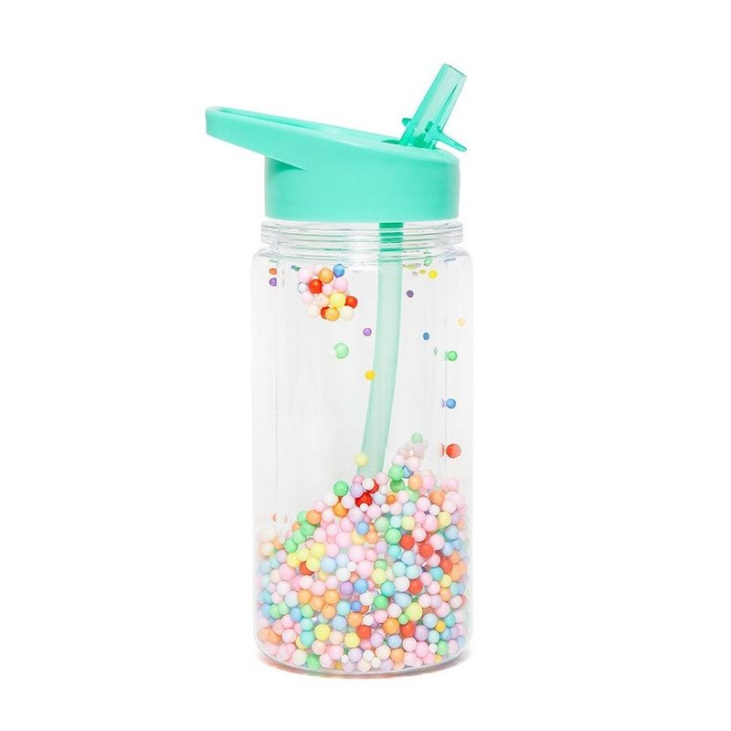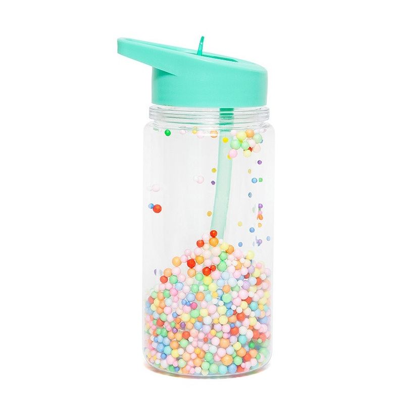 Drikkedunken er udstyret med løse konfettikuger, der ligger i et lag mellem yder- og indersiden af drikkedunken, og når der drikkes af flasken, hvirvler glimmeret rundt. Dunken har et grønt låg og en praktisk drikketud.