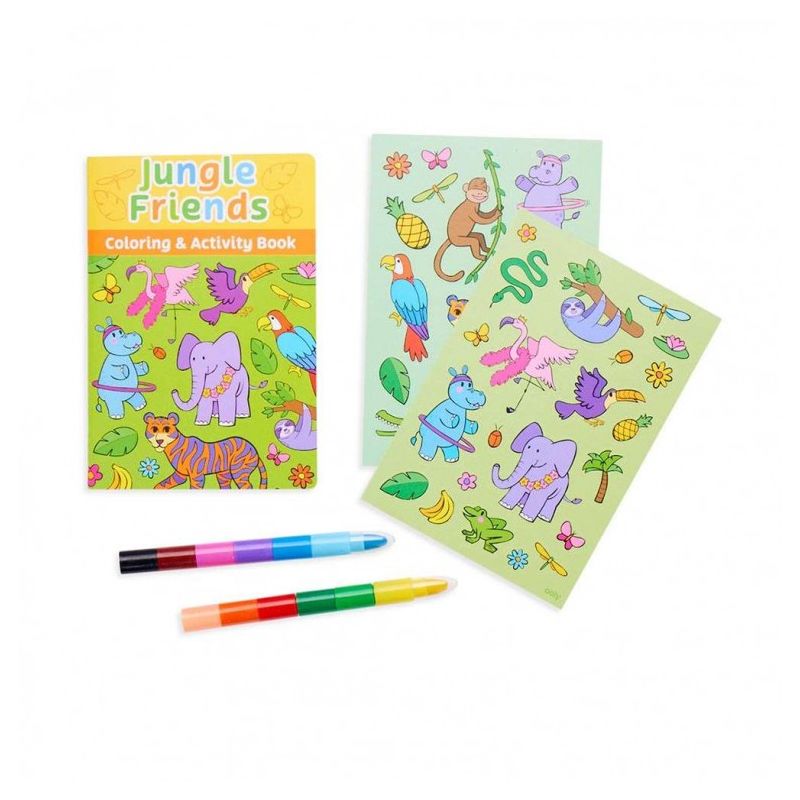 Her i Banditten og i webshoppen har vi et stort udvalg i kreativ leg og her kan vi præsentere en praktisk Jungle Friends - lille rejsetaske indeholdende en male- og aktivitetsbog, 12 små farver samt 2 ark klistermærker med et jungle tema.