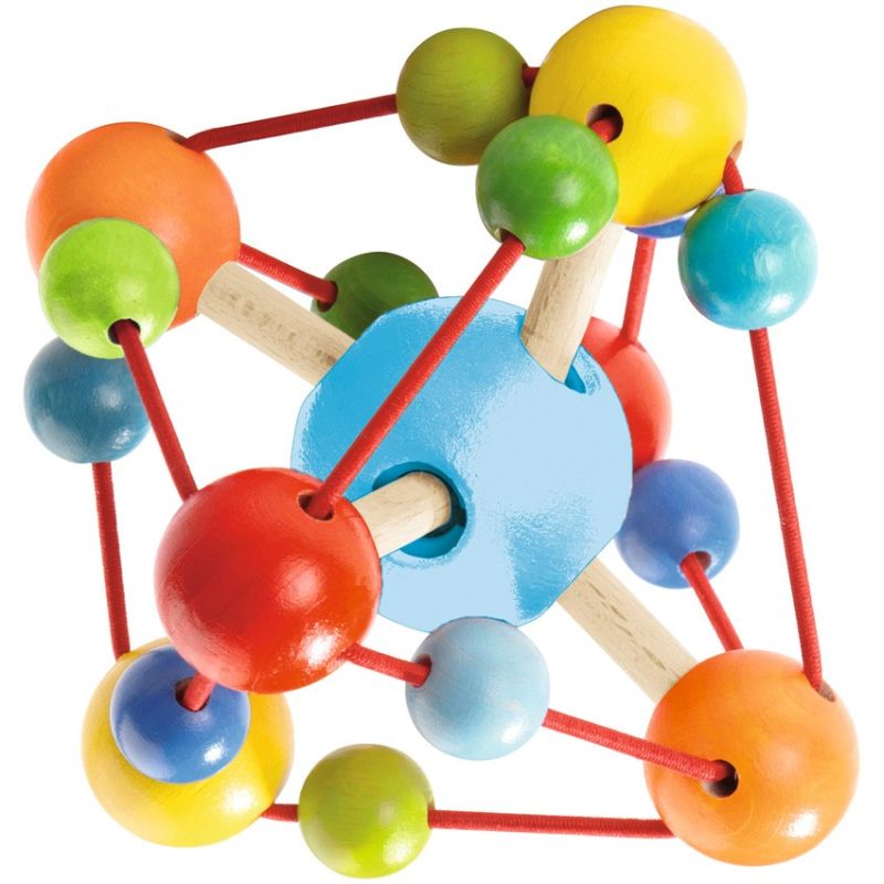De flotte farverige kugler sidder fast på en kraftig elastiksnor, hvilket gør Molekyle-ranglen både fast og meget bevægelig på samme tid. Træranglen er fremstillet i bøgetræ og indfarvet med giftfri vandfarver. Den er meget glat og dejlig at røre ved, og bevægeligheden opfordrer barnet til at undersøge og lege med legetøjet.