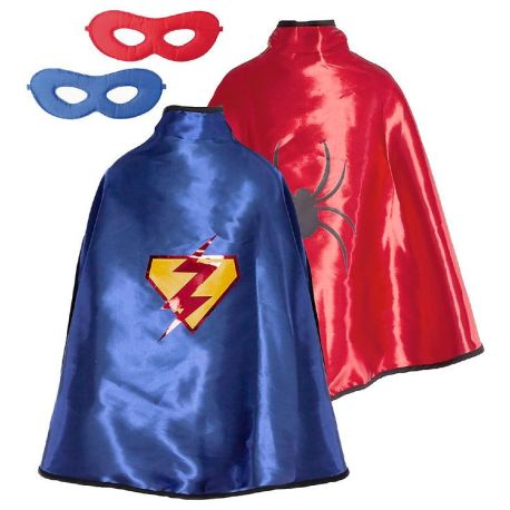 Med denne kappe kan jeres barn vælge, om han skal have blå satin kappe på med supermandstegn på ryggen eller rød kappe med edderkop på ryggen. Kappen er lavet i polyester og lukkes og åbnes med velcro.
