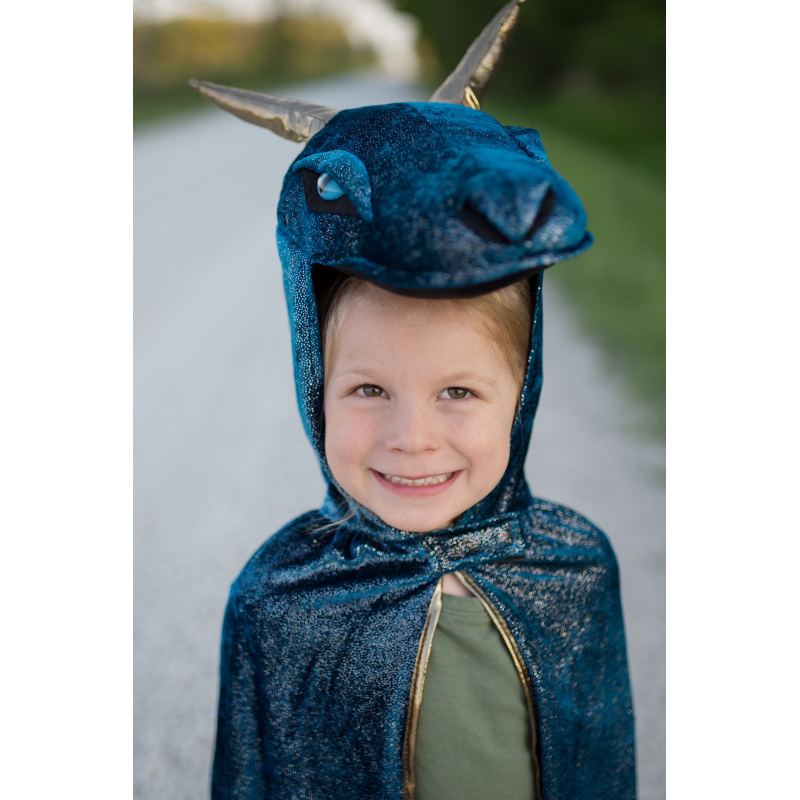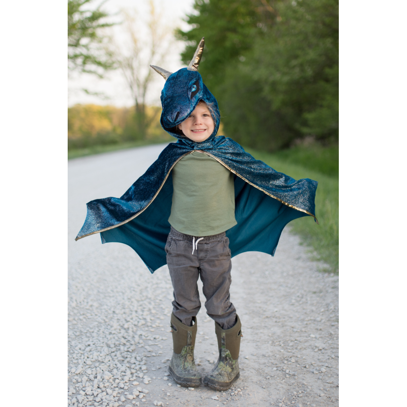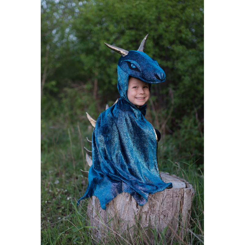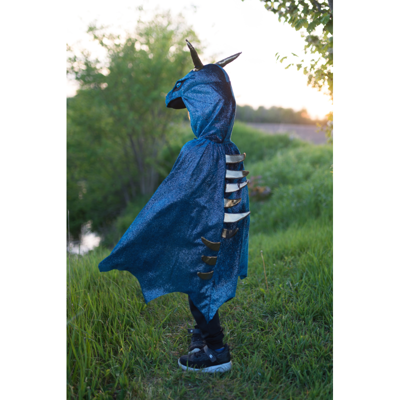 Skal jeres barn til fastelavnsfest, halloween eller blot lege rollespil er denne fantastise Starry Night Dragon kappe med hætte, der er designet som en farlig drage med 2 guldhorn i panden, en sjov idé. Den blå kappe med sølvglimmer falder smukt ind i ethvert miljø. Det bløde stof er pyntet med sølvglimmer og har flotte guldkanter ned langs åbningen på kappen. Forneden er kappen afsluttet med en takket kant og på ryggen er fine dragefinner.