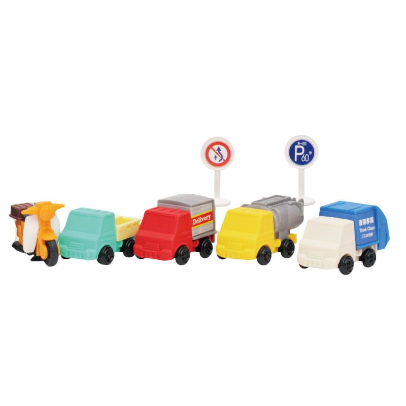 Det japanske firma Iwako har lavet nogle fine, anderledes viskelædere, og her kan vi præsentere en pakning med 5 viskelædere & 4 skilte. Viskelæderne er formet som flotte arbejdsbiler samt 1 stk. sej scooter!